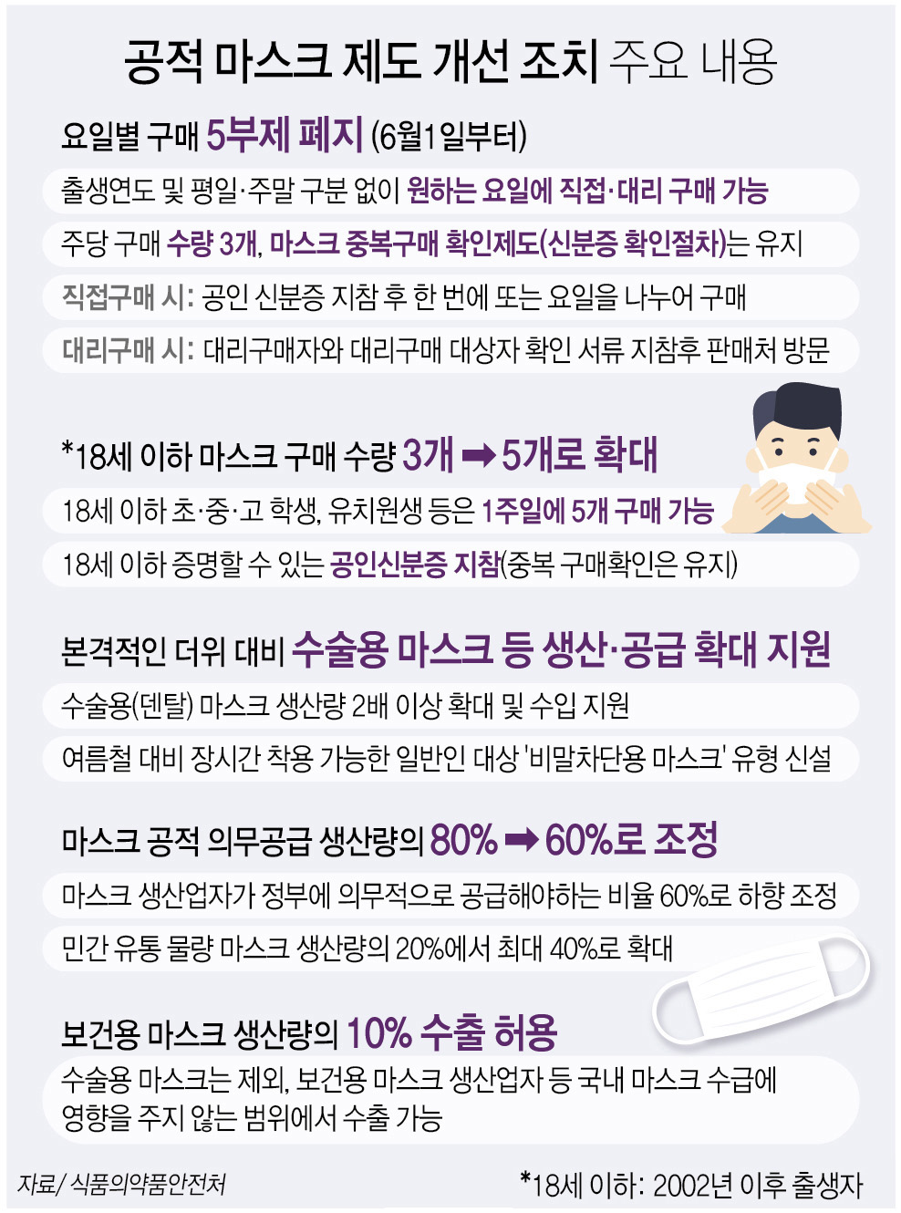 공적마스크 5부제는 폐지됐지만 마스크 중복구매 확인 제도는 계속 유지된다. 종전과 같이 본인을 증명할 수 있는 공인 신분증을 지참한 뒤 한 번에 또는 요일을 나누어 구매할 수 있다. 대리구매 시에는 대리구매자와 대리구매 대상자를 확인할 수 있는 서류를 갖추어 판매처에 방문하면 된다. 가족 한 명이 가족관계증명서와 본인의 신분증을 제시하면 모든 가족의 마스크를 대신 구매할 수 있다. 18세 이하인 2002년 이후 출생자는 마스크를 1주일에 5개씩 살 수 있다. 등교 수업에 맞춰 학생들이 안심하고 수업을 받을 수 있도록 한 것이다.